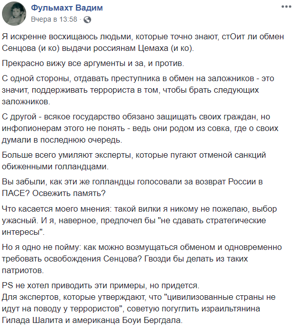 "Я искренне восхищаюсь людьми, которые точно знают, стОит ли обмен Сенцова (и ко) выдачи россиянам Цемаха (и ко).