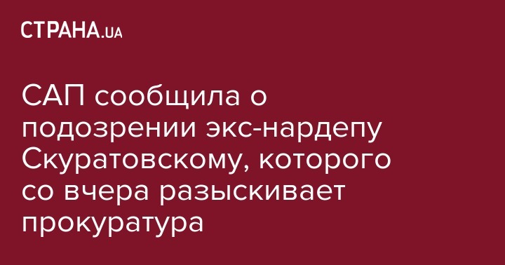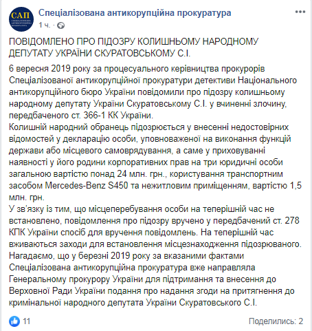 Национальное антикоррупционное бюро и Специализированная антикоррупционная прокуратура сообщили о подозрении бывшему народному депутату от Радикальной партии Сергею Скуратовскому. Он подозревается в сокрытии наличия у его семьи корпоративных прав на три юридических лица общей стоимостью более 24 млн. грн, пользования транспортным средством Mercedes-Benz S450 и нежилым помещением, стоимостью 1,5 млн грн.