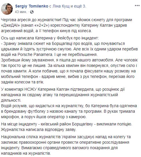 "Национальный союз журналистов Украины осуждает нападение на коллегу и призывает правоохранительные органы провести оперативное расследование инцидента. Требуем справедливого весомого наказания для нападавших на журналистов",  - заявил Сергей Томиленко.