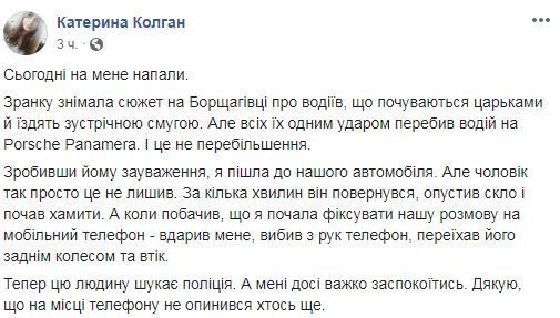 Одному из них, управлявшему Porsche Panamera Катерина Колган сделала замечание. "Но мужчина так просто это не оставил. Через несколько минут он вернулся, опустил стекло и начал хамить. А когда увидел, что я начала фиксировать наш разговор на мобильный телефон, ударил меня, выбил из рук телефон, переехал его задним колесом и скрылся", - написала журналистка.