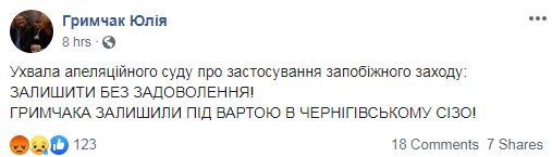 "Постановление апелляционного суда о применении меры пресечения: Оставить без удовлетворения! Грымчака оставили под стражей в Черниговском СИЗО!", - написала она на своей странице в Facebook.