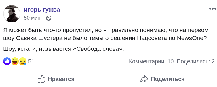 "Я может быть что-то пропустил, но я правильно понимаю, что на первом шоу Савика Шустера не было темы о решении Нацсовета по NewsOne? Шоу, кстати, называется "Свобода слова", написал Гужва.