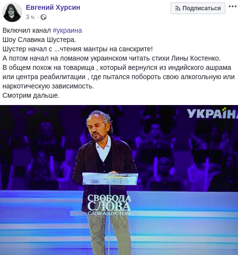 "Включил канал #украина. Шоу Славика Шустера. Шустер начал с ...чтения мантры на санскрите. А потом начал на ломаном украинском читать стихи Лины Костенко. В общем похож на товарища , который вернулся из индийского ашрама или центра реабилитации , где пытался побороть свою алкогольную или наркотическую зависимость. Смотрим дальше", пишет Евгений Хурсин.