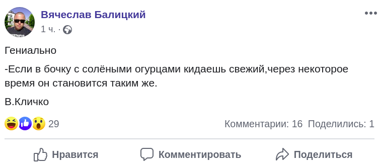 - Если в бочку с солеными огурцами кидаешь свежий, через некоторое время он становится такой же. В. Кличко"