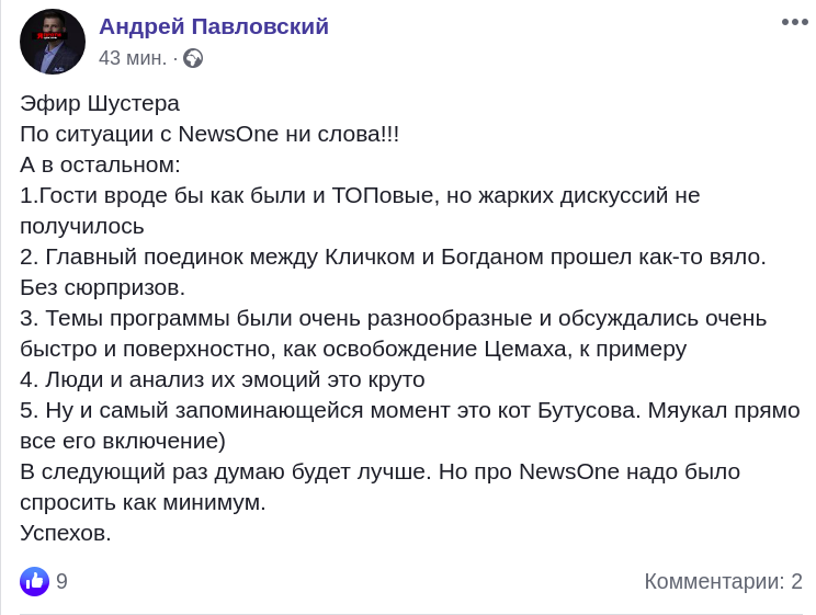 "В студии Савика Шустера на «Украине» Ахметова все потные. Видимо проблемы с кондиционером. Шустер хвастается изучением хинди и украинского, но ведёт шоу на русском. Орущий кот в квартире Бусутова, который вещает по скайпу, графика программы в стиле славных 90х. Геращенко снова примеряет амплуа главного расследователя всех преступлений в истории Украины. Такая вот премьера. Зато собрали все стороны политики".