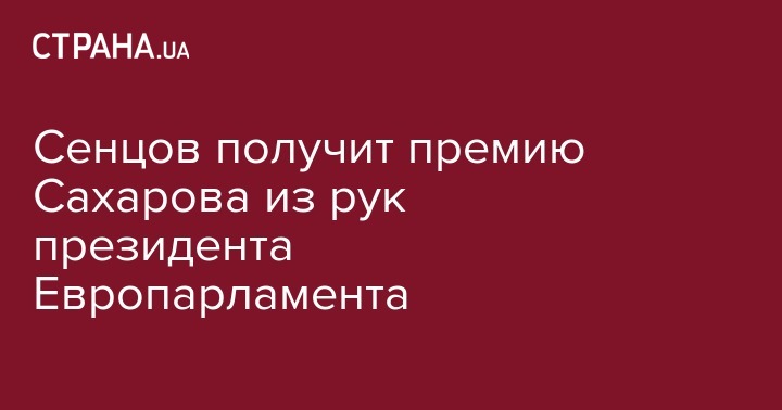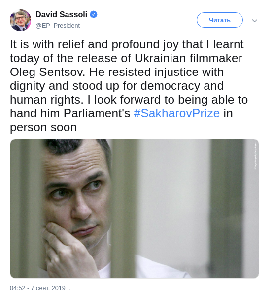 Президент Европейского парламента Давид-Мария Сассоли сообщил о том, что рад освобождению украинского режиссера Олега Сенцова. Сассоли так же ждет возможности лично вручить режисеру премию Сахарова. Об этом президент Европейского парламента написал на своей странице в Twitter.