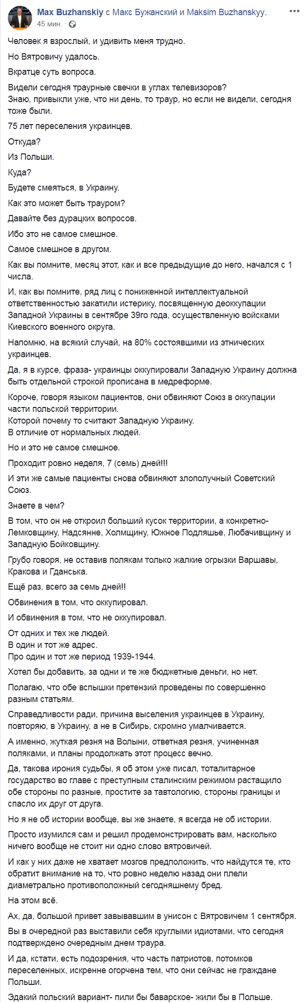 "Короче, говоря языком пациентов, они обвиняют Союз в оккупации части польской территории. Которой почему то считают Западную Украину", - подводит промежуточный итог Бужанский.
