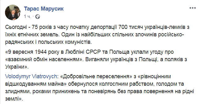 "Сегодня - 75 лет со времени начала депортации 700 тысяч украинских лемков с их этнических земель. Одно из крупнейших совместных преступлений российско-советских и польских коммунистов. 9 сентября 1944 года в Люблине СССР и Польша заключили соглашение о взаимном обмене населением. Выгоняли украинцев из Польши, а поляков из Украины", - написал Марусик.