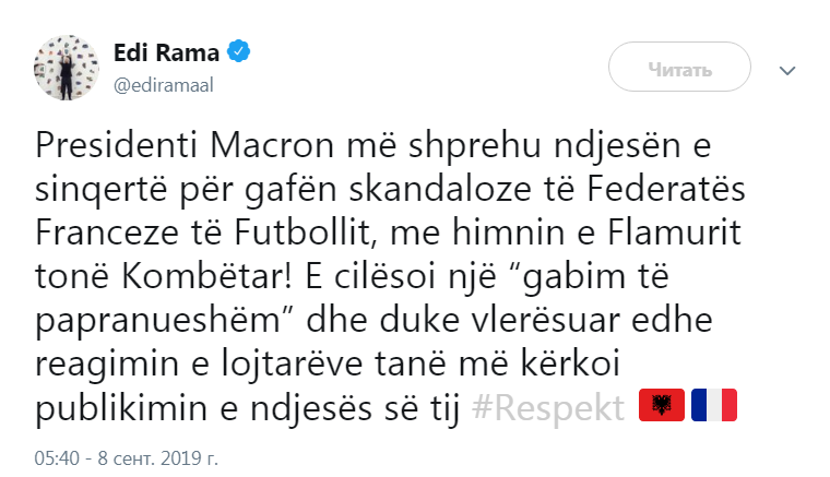 "Президент Макрон выразил свои искренние извинения за скандальную оплошность Французской федерации футбола с гимном. Назвав это недопустимой ошибкой и оценив реакцию наших игроков, он попросил меня опубликовать его извинения", - рассказал премьер Албании.