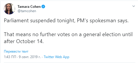 Напомним, в конце августа королева Великобритании Елизавета II одобрила просьбу премьера Бориса Джонсона временно прекратить работу парламента, чтобы он не смог заблокировать выход Британии из Евросоюза без соглашения. Поэтому британский парламент прекратит свою работу с 9 сентября по 14 октября.