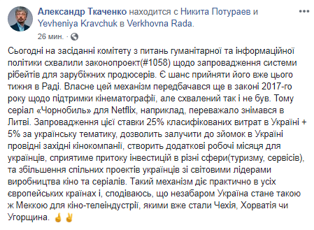 "Сегодня на заседании комитета по вопросам гуманитарной и информационной политики одобрили законопроект №1058 о введении системы рибейтов для зарубежных продюсеров. Есть шанс принять его уже на этой неделе в Раде. Собственно этот механизм предполагался еще в законе 2017 года по поддержке кинематографии, но одобрен так и не был. Поэтому сериал "Чернобыль" для Netflix, например, преимущественно снимался в Литве", - написал Ткаченко.