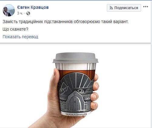 В "Укрзализныце" планируют отказаться от традиционных стаканов с металлическими подстаканниками для горячих напитков, а использовать бумажные стаканы. Об этом в Facebook написал председатель правления АО "Укрзализныця" Евгений Кравцов.