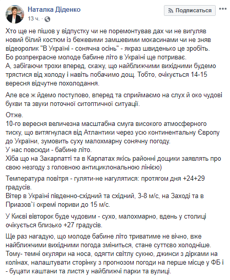 "... Распрекрасное молодое бабье лето в Украине еще продлится. А, забегая немного вперед, скажу, что в ближайшие выходные будем трястись от холода и даже увидим дождь. То есть, ожидается 14 - 15 сентября ощутимое похолодание", - написала Наталья Диденко.
