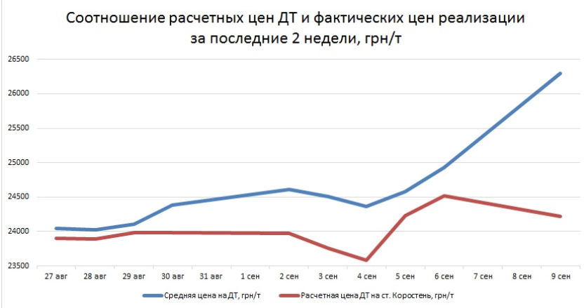 Кременчугский НПЗ, по информации участников рынка, ограничил отгрузку ДТ вагоноцистернами. Утром 9 сентября завод сначала повысил цену на 1300 грн/т, но затем снял цены с официального прейскуранта. В обед 9 сентября топливо с отгрузкой автотранспортом с НПЗ можно было приобрести по 22,75 грн/л.