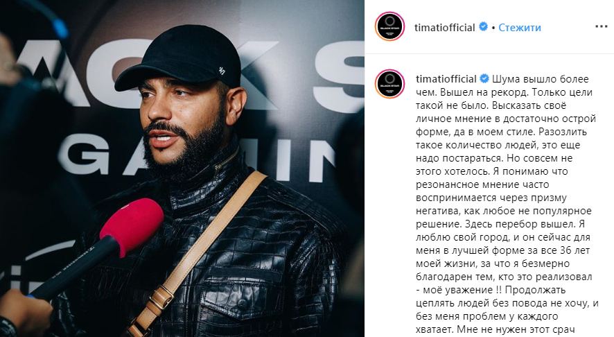 "Шума вышло более чем. Вышел на рекорд. Только цели такой не было. Высказать свое личное мнение в достаточно острой форме - да, в моем стиле. Разозлить такое количество людей - это еще надо постараться. Но совсем не этого хотелось. Я понимаю что резонансное мнение часто воспринимается через призму негатива, как любое не популярное решение. Здесь перебор вышел. Я люблю свой город, и он сейчас для меня в лучшей форме за все 36 лет моей жизни, за что я безмерно благодарен тем, кто это реализовал - мое уважение. Продолжать цеплять людей без повода не хочу, и без меня проблем у каждого хватает. Мне не нужен этот срач точно, поэтому, дорогие друзья: удаляю это видео что бы не продолжать эту волну негатива. Цели обидеть кого-либо не было", - говорится в опубликованном сообщении Тимати.