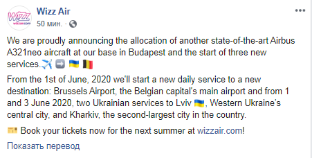Сообщается, что в столице Венгрии будет размещен дополнительный самолет Airbus A321neo, поэтому летом 2020 года оттуда будут запущены 3 новых рейса: с 1 июня - в аэропорт Брюсселя, а с 1 и 3 июня 2020 года - во Львов и Харьков соответственно.