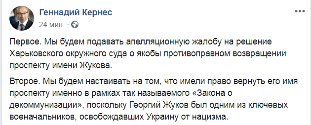 "Первое. Мы будем подавать апелляционную жалобу на решение Харьковского окружного суда о якобы противоправном возвращении проспекту имени Жукова. Второе. Мы будем настаивать на том, что имели право вернуть его имя проспекту именно в рамках так называемого "Закона о декоммунизации", поскольку Георгий Жуков был одним из ключевых военачальников, освобождавших Украину от нацизма", - поделился планами Кернес.