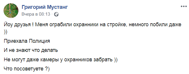 "Йоу друзья! Меня ограбили охранники на стройке, немного побили даже. Приехала Полиция. И не знают, что делать. Не могут даже камеры у охранников забрать. Что посоветуете?" - спросил Mustang.