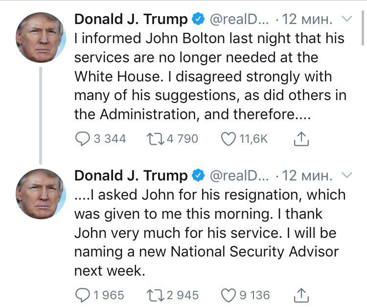 "Вчера я информировал Джона Болтона, что его услуги в Белом доме больше не нужны. Я категорически не согласен со многими из его предложений и попросил его уйти в отставку", - написал в Твиттере  Дональд Трамп.