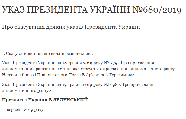Президент Украины Владимир Зеленский отменил присвоение дипломатических рангов депутатам Верховной Рады Владимиру Арьеву и Артуру Герасимову (оба члены фракции Петра Порошенко "Европейская солидарность"). Об этом говорится в Указе президента, опубликованном на сайте главы государства.