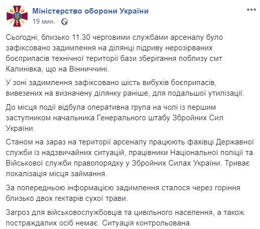 В Министерстве обороны прокомментировали информацию о взрывах, которые прогремели на арсенале в Калиновке в среду, 11 сентября. Как уточнили в ведомстве, на участке подрыва неразорвавшихся боеприпасов технической территории военного арсенала в пгт Калиновка Винницкой области около 11:30 было зафиксировано задымление и шесть взрывов боеприпасов.