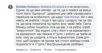 "Единственное, за что мне неловко - это то, что я повелся на эмоции... и перешел на личности. Это по Юлии Корзун... Но еще раз: я не делаю попыток "выкрутиться". Ни от каких слов в посте я не отказывался и не откажусь: вас желательно п@@дить, и делать это надо не всем, кому вы вредите, а только журналистам", - написал Кутепов.