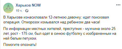 Днем в среду, 11 сентября, в Харькове мужчина изнасиловал 12-летнюю девочку. Об этом сообщается на странице "Харьков Now" в Facebook.