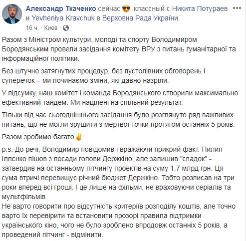 "Филипп Ильенко ушел с поста председателя Госкино, но оставил "наследство" - утвердил на последнем питчинге проектов на сумму 1,7 млрд грн. Эта сумма втрое превышает годовой бюджет Госкино. То есть расписал на три года вперед все деньги. И это только на фильмы, не считая сериалов и мультфильмов", - сообщил Ткаченко.