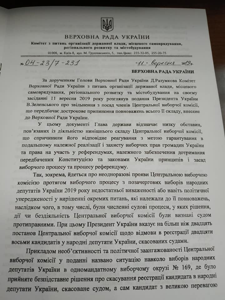 Ранее в Зе-команде допускали, что в парламенте могут рассмотреть представление президента на увольнение всех членов ЦИК именно в четверг, 12 сентября.