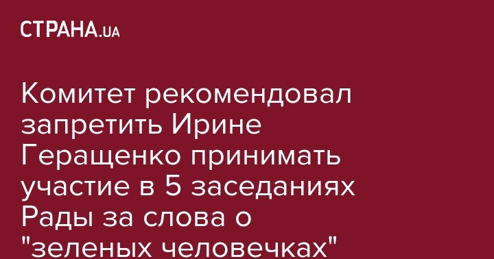 В четверг, 12 сентября, Комитет по вопросам регламента рекомендовал Верховной Раде запретить нардепу Ирине Геращенко ("Европейская солидарность") участвовать в пяти заседаниях парламента за неэтичные высказывания. Об этом в Facebook сообщила журналист Татьяна Николаенко.