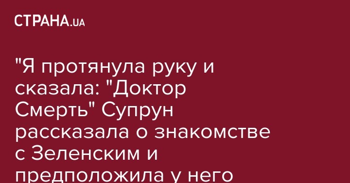 "Расскажу вам один момент, он вам точно понравится. Вы упомянули, как президент меня называл, когда выступал по телевизору - точнее, не назвал, но почти назвал. Когда при знакомстве он протянул руку и сказал: "Владимир Зеленский", я протянула руку и сказала: "Доктор Смерть. Но это смерть советской медицины ". Он посмеялся и сказал: "Ну, нормально", - вспомнила бывшая глава Минздрава.
