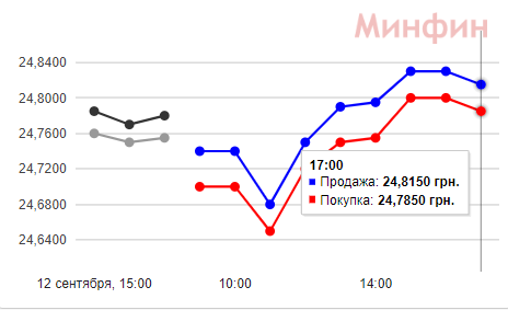 По состоянию на 17:15 курс выровнялся: покупка 24,80 грн, продажа 24,85 грн.