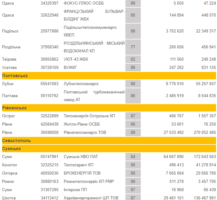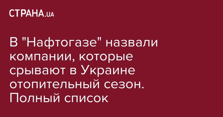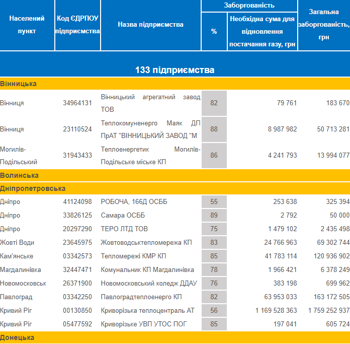 "НАК "Нафтогаз Украины" информирует о производителях тепла, которые не выполняют требования законодательства относительно минимального уровня расчетов для получения газа в пределах спецобязанностей (ПСО) ... Сейчас список включает 133 должника при общем количестве теплопроизводителей (на момент завершения прошлого отопительного сезона) - 1316 предприятий", - говорится в сообщении.