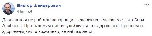 "Давненько я не работал папарацци. Человек на велосипеде - это Бари Алибасов. Проехал мимо меня, улыбнулся, поздоровался. Проблем со здоровьем, чисто визуально, не наблюдается", - утверждает Шендерович.