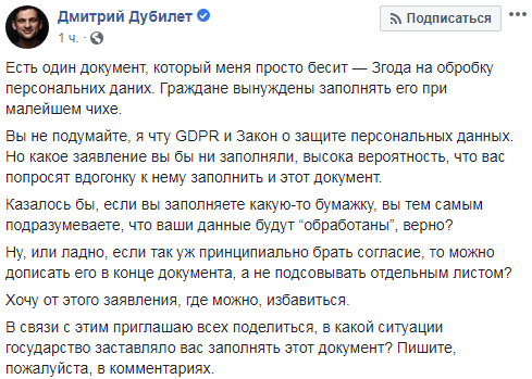 "Есть один документ, который меня просто бесит - "Згода на обробку персональних даних". Граждане вынуждены заполнять его при малейшем чихе. Вы не подумайте, я чту GDPR и закон "О защите персональных данных". Но какое заявление вы бы ни заполняли, высока вероятность, что вас попросят вдогонку к нему заполнить и этот документ… Хочу от этого заявления, где можно, избавиться", - написал Дубилет в Facebook.
