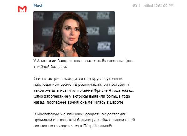 "Сейчас актриса находится под круглосуточным наблюдением врачей в реанимации, ей поставили такой же диагноз, что и Жанне Фриске четыре года назад. Само заболевание у актрисы выявили больше года назад, последнее время она лечилась в Европе", – говорится в сообщении.