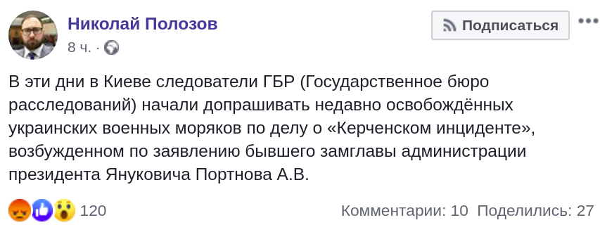 "В эти дни в Киеве следователи ГБР (Государственное бюро расследований) начали допрашивать недавно освобождённых украинских военных моряков по делу о "Керченском инциденте", возбужденном по заявлению бывшего замглавы администрации президента Януковича Портнова А.В.", - написал Полозов.