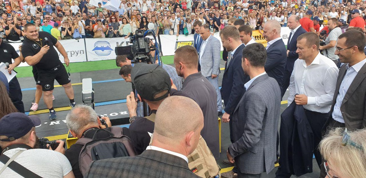 В городе на празднике проходил Чемпионат по стронгмену, куда явился глава государства. Так, один участников силового вида спорта закончил упражнение и на импровизированную арену вышел Зеленский с Богданом.