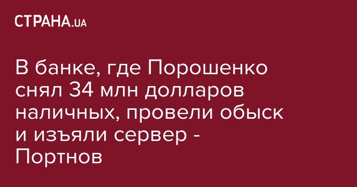 "Злые языки утверждают, что вчера при обыске в Международном инвестиционном банке, откуда Порошенко в мае-июне этого года вынес 340 килограмм наличных долларов, следователи изъяли сервер с видеофайлами, кассовые ордера, подтверждающие факт снятия 34 млн долларов и все платежные документы", - написал Портнов.