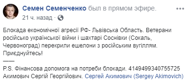 "У Семена Семенченко видно закончились ресурсы после последней блокады и депутатство больше не приносит денег, теперь снова перешел к активным действиям. Будет качать Зеленского. Блокирует поезд с углем во Львовской области, который якобы из РФ и снова просит денег на карту... Сколько времени активисты будут выше закона? Выбрали уже новую Раду. Не нравится пиши обращение, ходи на приемы, регистрируйте петиции. Нет, надо палатки, одеяло, еда, волонтеры и движ", - добавил он.
