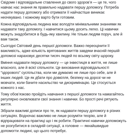 Умение оказывать первую помощь - это инвестиция в жизнь, не только собственную, но и всего общества. Это воспитание ответственности "здорового" общества, когда мы думаем не только о себе, но и о других людях. Это как заботиться об окружающей среде, безопасности на дороге или не молчать, когда видите насилие или дискриминацию. Это касается каждого из нас.