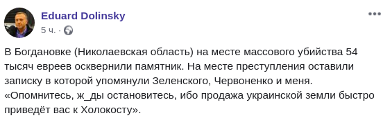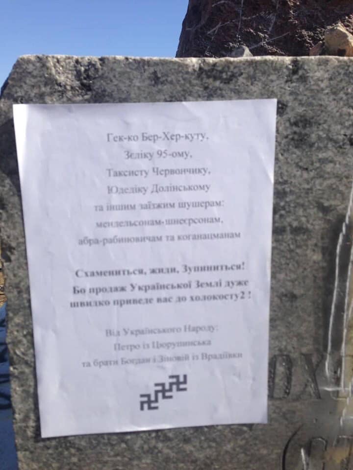 На фото, которым Долинский сопроводил свою публикацию, видно, что неизвестные нарисовали на монументе свастику и разместили записку с угрозами, адресованную президенту Владимиру Зеленскому, бывшему министру транспорта Евгению Червоненко, а также директору Украинского еврейского комитета.