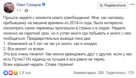 "Прошла неделя с момента моего освобождения. Мне, как человеку прибывшему на машине времени из 2014 года, было интересно посмотреть какие перемены произошли в стране и в людях. Неделя, конечно же короткий срок, но я успел много где побывать и много с кем пообщаться", - написал Олег Сенцов.