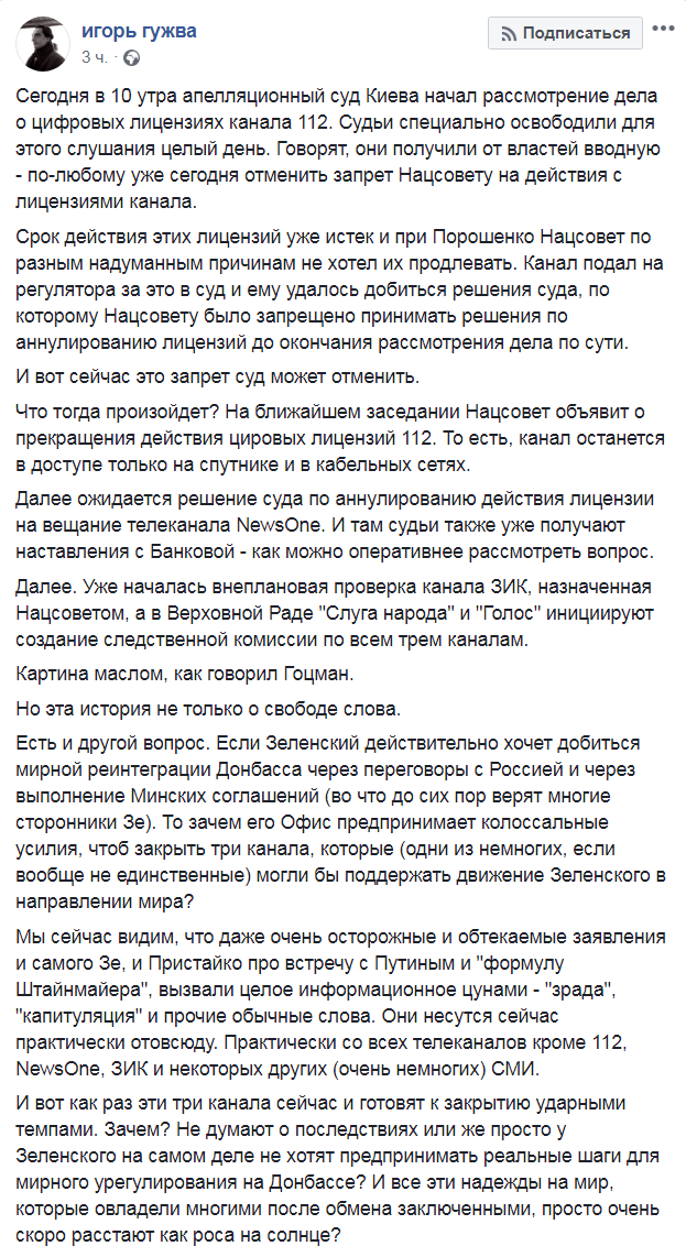 "И вот как раз эти три канала сейчас и готовят к закрытию ударными темпами. Зачем? Не думают о последствиях или же просто у Зеленского на самом деле не хотят предпринимать реальные шаги для мирного урегулирования на Донбассе? И все эти надежды на мир, которые овладели многими после обмена заключенными, просто очень скоро растают как роса на солнце?" - спрашивает Игорь Гужва.