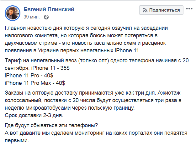 Плинский также написал, что заказы на оптовую доставку принимают уже три дня. При этом возник колоссальный ажиотаж: поставки с 20 сентября будут осуществляться три раза в неделю микроавтобусами через польскую границу. Срок доставки смартфонов - 2-3 дня.