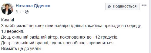 В Киев в среду, 18 сентября, придет резкое похолодание с падением температуры до +12 градусов. Об этом на своей странице в Facebook написала синоптик Наталка Диденко.