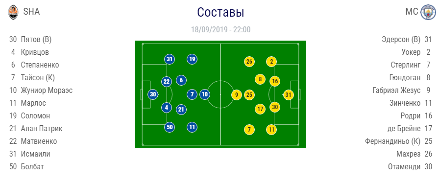 Манчестер Сити: Эдерсон – защитники - Уокер, Отаменди, Фернандиньо, Зинченко – полузащитники - Гюндоган, Родри – Марез, Де Брюйне, Стерлинг – нападающий Жезус