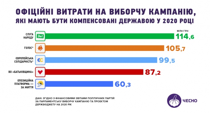 По данным Движения ЧЕСНО, в структуре расходов этих партий на избирательную кампанию от 61% до 86% составляют расходы на телерекламу. Вторая по объемам статья расходов - наружная реклама (от 9% до 20%). Именно эти расходы парламентским партиям и будут компенсированы. Сумма компенсации зависит от официальной суммы расходов на кампанию: сколько партии потратили - столько и вернут из бюджета.