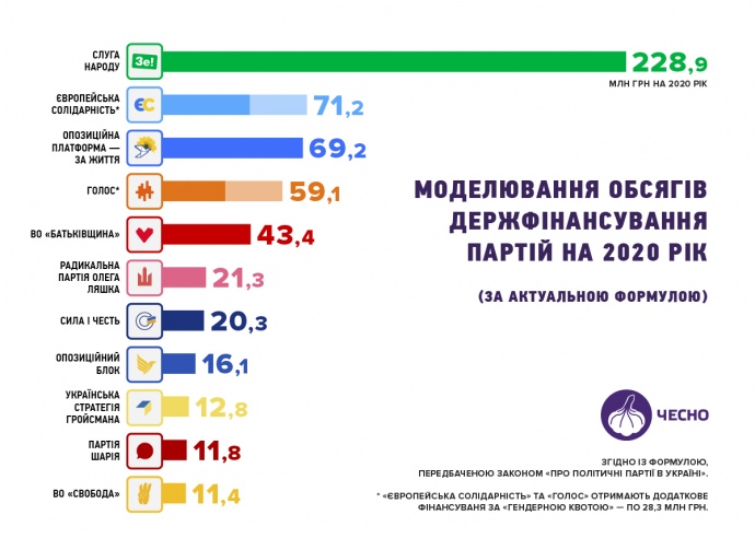 Также в проекте госбюджета на 2020 год предусмотрено 567 миллионов гривен на финансирование уставной деятельности всех 11 партий, которые набрали от 2% голосов избирателей.