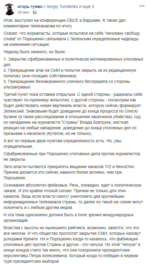 Главный редактор "Страны" Игорь Гужва выступил на конференции ОБСЕ в Варшаве, на которой рассказал о ситуации со свободой слова в Украине.